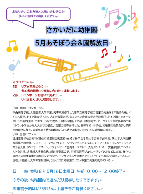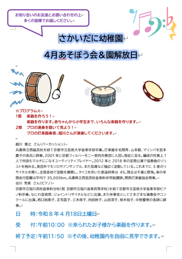 未就園児のおともだち・卒園児のみんなもぜひ遊びに来てください。 |