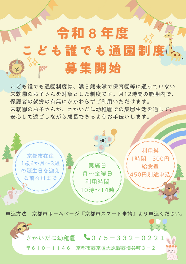 9月5日(金)入園説明会を予定していましたが、京都府南部に気象警報(暴風警報・特別警報)が朝7時の時点で発令されている場合は9月16日(火)に延期させて頂きます。詳細は同様とさせていただきます。 |